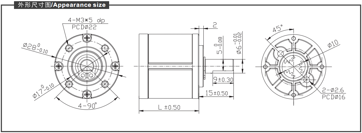 輸出軸直徑為Φ6.0mm,長度可根據(jù)客戶要求定制