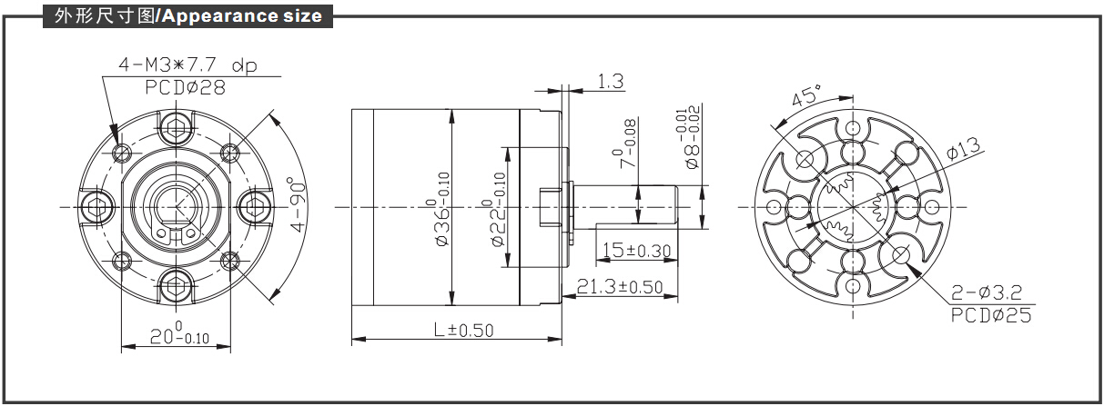 輸出軸直徑為Φ8.0mm,長(zhǎng)度可根據(jù)客戶(hù)要求定制