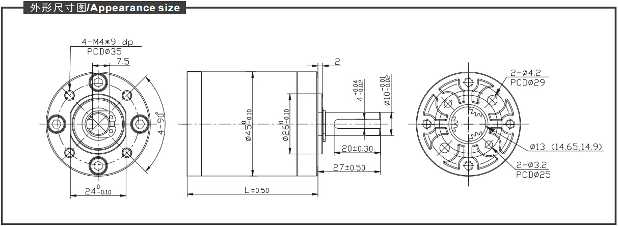 輸出軸直徑為Φ10.0mm,長度可根據(jù)客戶要求定制