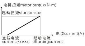 這是電機(jī)的第二個(gè)重要特性,電流和電機(jī)扭矩呈線性關(guān)系,用來計(jì)算空載電流和轉(zhuǎn)子靜止時(shí)的電流(起動(dòng)電流)。關(guān)系圖中并未隨著電機(jī)供電電壓而變化。曲線終點(diǎn)的延長(zhǎng)線和扭矩,起始電流相一致,曲線的斜率被稱作電機(jī)的扭矩常數(shù)。